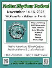 The 17th Annual Native Rhythms Festival will take place on Friday, November 14th through Sunday, November 16th at Wickham Park Amphitheater under the beautiful pines. The three-day family friendly free of admission festival celebrates and honors Native American Heritage Month each November. Musical and Cultural Dance performances are highlighted on the Amphitheater Stage from 9 am to 9 pm Friday and Saturday, 9 am to 5 pm on Sunday. Award winning artists take the stage and present beautiful music and dance for all to enjoy. The festival provides a Vendor Village where over 40 artists and craftspeople provide shopping opportunities for one-of-a-kind creations. An Exhibitor Village is the place to meet our local nonprofit organizations that will provide educational experiences for all. The Workshop program covers diverse topics with a variety of educators and hands on skills presentations. The East Meets West Exhibit provides a museum quality living history immersion into the cultures of Americas original peoples. Katrina BigMountain provides a living history presentation of the roles of women in Native Cultures. Special Veteran's Day programs will remember and honor those who have served and are serving our Country, Come join the celebration and be a part of this family friendly Festival.
