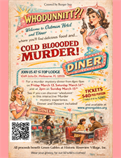 Join us at the Fraternal Order of Police Lodge for a murder mystery dinner from 6 PM to 9 PM on Friday, March 13th, Saturday, March 14th at 6 PM, and Sunday afternoon at 2 PM, March 15th.