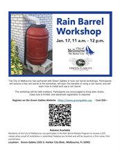 Limited quantity of Barrels available. Register to receive your Rain Barrel. The cost of a Rain Barrel is normally $65. When you register you will receive an automatic discount of $15. Additionally, if you are a resident of Melbourne you may participate in the City of Melbourne's Rain Barrel Rebate Program and receive a $25 rebate. Your Rain Barrel will end up costing you only $25. If you live outside Melbourne city limits, check with your municipality to see if they offer a rain barrel rebate.